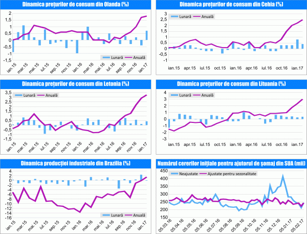 Preţurile de consum din Cehia au crescut peste aşteptări şi în februarie 2017, cu o rată anuală de 2,5%, după un avans de 2,2% în luna precedentă, pe fondul unei creşteri lunare de 0,4%, după o creştere de 0,8% în luna anterioară. Preţurile alimentelor şi-au accelerat creşterea anuală până la 4,6%, de la 3,5% în luna precedentă, în condiţiile unei creşteri lunare de 1,4%, iar preţurile utilităţilor şi-au menţinut creşterea anuală la 0,8%, pe fondul unei scăderi lunare de 0,1%.