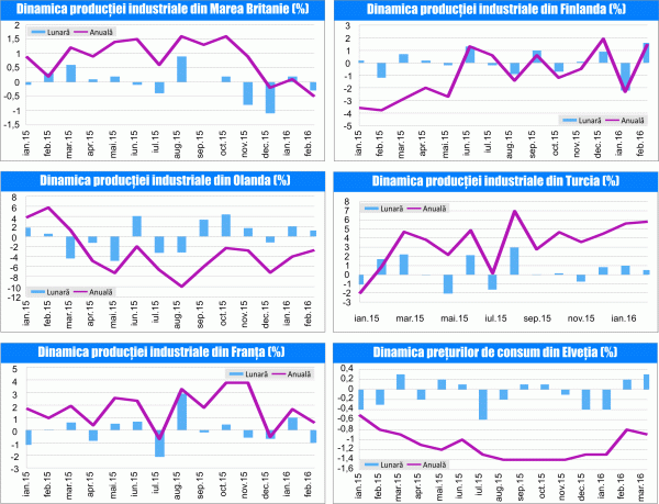 Producţia industrială din Marea Britanie a scăzut neaşteptat în februarie 2016, cu o rată lunară de 0,3%, după un avans de 0,2% în luna precedentă, iar scăderea anuală a fost de 0,5%, după o creştere de 0,1% în luna anterioară. Producţia din industria prelucrătoare şi-a accelerat declinul anual până la 1,8%, de la 0,3% în luna precedentă, în condiţiile unei scăderi lunare de 1,1%, iar producţia de energie şi-a accelerat declinul anual până la 4,5%, de la 3,6% în luna anterioară, pe fondul unei creşteri lunare de 0,7%.