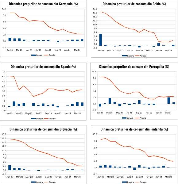 Preţurile de consum din Germania şi-au menţinut creşterea anuală la 2,2% în aprilie 2024, pe fondul unei creşteri lunare de 0,5%, după un avans de 0,4% în luna anterioară. Preţurile alimentelor au crescut cu o rată anuală de 0,5%, după o scădere de 0,7% în luna precedentă, în condiţiile unei creşteri lunare de 0,4%, iar preţurile utilităţilor şi-au accelerat creşterea anuală până la 1,2%, de la 0,9% în luna anterioară, pe fondul unei creşteri lunare de 0,5%, în condiţiile unei scăderi anuale de 3,2% a preţurilor energiei. (Destatis)Preţurile de consum din Cehia şi-au menţinut creşterea anuală la 2% în martie 2024, pe fondul unei creşteri lunare de 0,1%, după un avans de 0,3% în luna anterioară. Preţurile alimentelor şi-au temperat scăderea anuală până la 2,7%, de la 5,9% în luna precedentă, în condiţiile unei creşteri lunare de 1,7%, iar preţurile utilităţilor au crescut cu o rată anuală de 3,3%, după o creştere de 3,5% în luna anterioară, pe fondul unei scăderi lunare de 0,1%. (CZSO)Preţurile de consum din Spania şi-au accelerat creşterea anuală în aprilie 2024, până la 3,3% de la 3,2% în luna precedentă, pe fondul unei creşteri lunare de 0,7%, după o creştere de 0,8% în luna anterioară. Preţurile alimentelor şi-au accelerat creşterea anuală până la 4,7%, de la 4,3% în luna precedentă, în condiţiile unei creşteri lunare de 0,7%, iar preţurile utilităţilor au crescut cu o rată anuală de 4%, după o creştere de 1,5% în luna anterioară, pe fondul unei creşteri lunare de 0,5%. (INE Spain)Preţurile de consum din Portugalia şi-au temperat creşterea anuală în aprilie 2024, până la 2,2%, de la 2,3% în luna precedentă, pe fondul unei creşteri lunare de 0,5%, după o creştere de 2% în luna anterioară. Preţurile alimentelor au crescut cu o rată anuală de 0,3%, după o stagnare în luna precedentă, în condiţiile unei noi creşteri lunare de 0,2%, iar preţurile utilităţilor au crescut cu o rată anuală de 7,3%, după o creştere de 5,8% în luna anterioară, pe fondul unei scăderi lunare de 0,5%. (INE Portugal)Preţurile de consum din Slovacia şi-au temperat creşterea anuală în aprilie 2024, până la 2,1%, de la 2,3% în luna precedentă, pe fondul unei creşteri lunare de 0,3%, după o creştere de 0,1% în luna anterioară. Preţurile alimentelor au stagnat faţă de aceeaşi perioadă a anului trecut, după o creştere de 0,6% în luna precedentă, în condiţiile unei noi scăderi lunare de 0,4%, iar preţurile utilităţilor şi-au menţinut creşterea anuală la 0,1%, pe fondul unei creşteri lunare de 0,1%. Indicele core al preţurilor şi-a temperat creşterea anuală până la 2,3%, de la 2,7%, pe fondul unei creşteri lunare de 0,3%. (SOSR)Preţurile de consum din Finlanda şi-au temperat creşterea anuală în aprilie 2024, până la 1,9% de la 2,2% în luna precedentă, pe fondul unei stagnări lunare, după o scădere de 0,1% în luna anterioară. Preţurile alimentelor au scăzut cu o rată anuală de 0,9%, după o scădere de 1,9% în luna precedentă, în condiţiile unei scăderi lunare de 0,3%, iar preţurile utilităţilor au crescut cu o rată anuală de 3%, după o creştere de 3,5% în luna anterioară, pe fondul unei stagnări lunare, în condiţiile unei scăderi anuale de 10,4% a preţurilor energiei. (Finland Statistics)