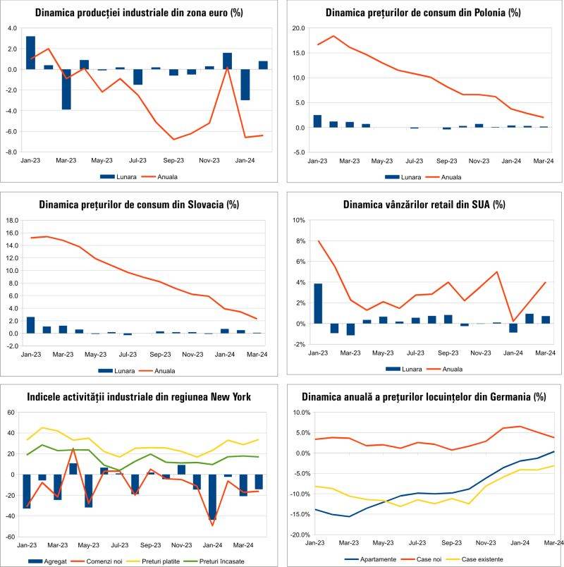 Valoarea nominală a vânzărilor retail din SUA a crescut cu o rată anuală de 4% în martie 2024, după o creştere de 2,1% în luna precedentă, pe fondul unei creşteri lunare peste aşteptări, de 0,7%, după o creştere de 0,9% în luna anterioară. Vânzările de produse alimentare şi-au accelerat creşterea anuală până la 1,4%, de la 0,5%, în condiţiile unei creşteri lunare de 0,5%, iar vânzările de combustibili auto şi-au temperat scăderea anuală până la 0,7%, de la 3,7%, pe fondul unei creşteri lunare de 2,1%. (US Census Bureau)