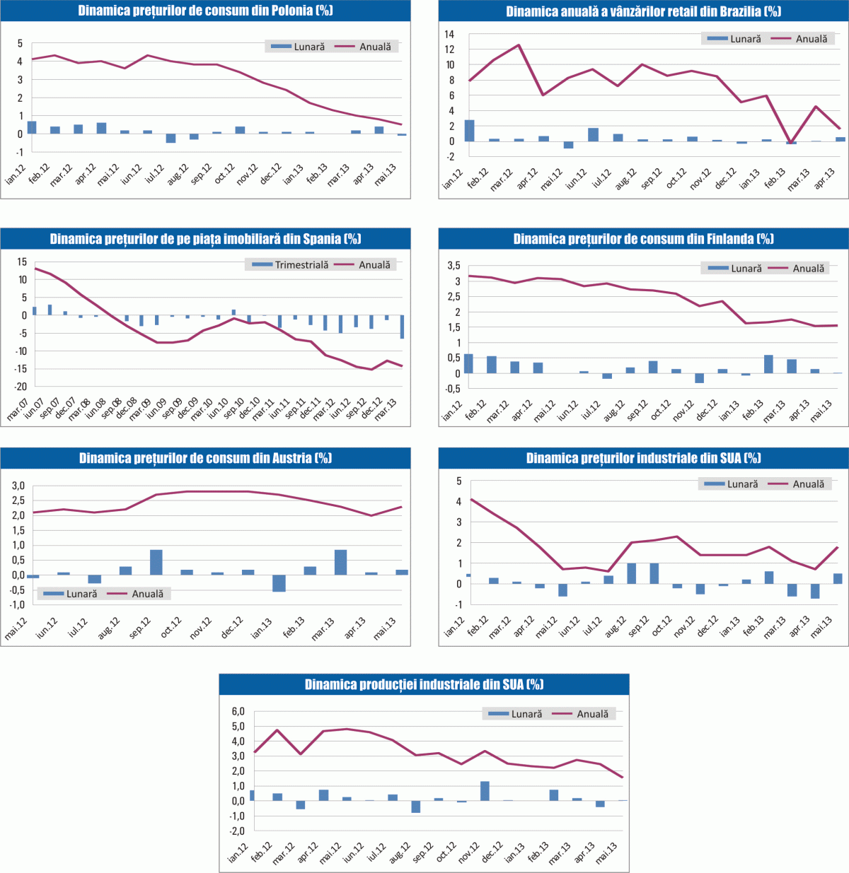 Preţurile de consum din Austria şi-au accelerat creşterea anuală în luna mai 2013 până la 2,3%, de la 2% în luna precedentă, pe fondul unei creşteri lunare de 0,2%, după un avans de 0,1% în luna anterioară. Preţurile alimentelor şi-au accelerat creşterea anuală până la 4,7%, de la 3,9% în luna precedentă, în condiţiile unei creşteri lunare de 0,7%, iar preţurile utilităţilor şi-au temperat creşterea anuală până la 2,4%, de la 2,5% în luna anterioară, pe fondul unei creşteri lunare de 0,2%.