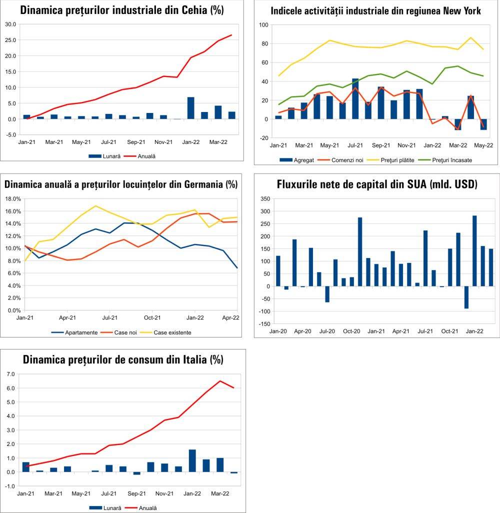 Preţurile de consum din Italia şi-au temperat creşterea anuală în aprilie 2022, până la 6%, la 6,5% în luna precedentă, pe fondul unei scăderi lunare de 0,1%, după un avans de 1% în luna anterioară. Preţurile alimentelor şi-au accelerat creşterea anuală până la 6,4%, de la 5,8% în luna precedentă, în condiţiile unei creşteri lunare de 1,3%, iar preţurile utilităţilor şi-au temperat creşterea anuală până la 24,7%, de la 28,3% în luna anterioară, pe fondul unei scăderi lunare de 1,8%. (Sursa: Istat)