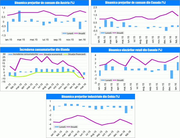 Preţurile de consum din Canada şi-au temperat creşterea anuală în februarie 2016, până la 1,4%, de la 2% în luna precedentă, pe fondul unei noi creşteri lunare de 0,2%. Preţurile alimentelor şi-au temperat creşterea anuală până la 3,9%, de la 4% în luna precedentă, în condiţiile unei creşteri lunare de 0,3%, iar preţurile utilităţilor şi-au accelerat creşterea anuală până la 1,2%, de la 1,1% în luna anterioară, pe fondul unei noi creşteri lunare de 0,1%. Indicele core al preţurilor şi-a temperat creşterea anuală până la 1,9%, de la 2% în luna precedentă, în condiţiile unei creşteri lunare de 0,5%.