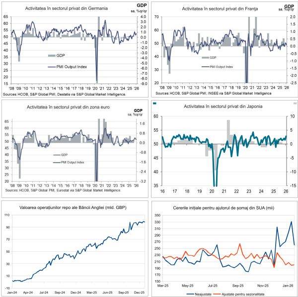 Activitatea în sectorul privat din zona euro s-a menţinut în ianuarie 2026 la nivelul lunii precedente, pe fondul creşterii din servicii. Indicele agregat al activităţii a rămas la 51,5 puncte (o valoare sub 50 arată contracţie), în condiţiile în care indicele activităţii din servicii a scăzut cu 0,5 puncte, până la 51,9 puncte. Indicele activităţii din industria prelucrătoare a crescut cu 0,6 puncte, până la 49,4 puncte, în condiţiile creşterii indicelui producţiei cu 0,3 puncte, până la 50,2 puncte. Expansiunea activităţii din sectorul privat a avut loc pe fondul accentuării creşterii costurilor de producţie şi a preţurilor produselor finite. (S&P Global)