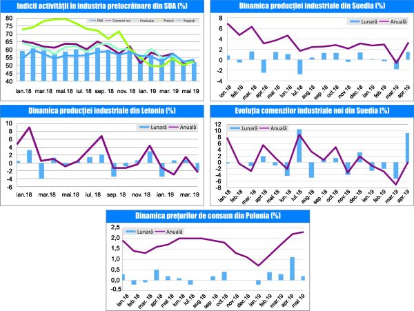 Activitatea în industria prelucrătoare din SUA s-a temperat neaşteptat în luna mai 2019, pe fondul creşterii comenzilor noi. Indicele agregat al activităţii a scăzut până la 52,1, de la 52,8 în luna precedentă (o valoare sub 50 arată contracţie), în condiţiile în care indicele producţiei a scăzut până la 51,3 de la 52,3 în luna anterioară. Indicele comenzilor noi a crescut cu un punct, până la 52,7, în condiţiile în care indicele preţurilor a crescut cu 3,2 puncte, până la 53,2. Indicele numărului de angajaţi a crescut cu 1,3 puncte, până la 53,7 puncte.