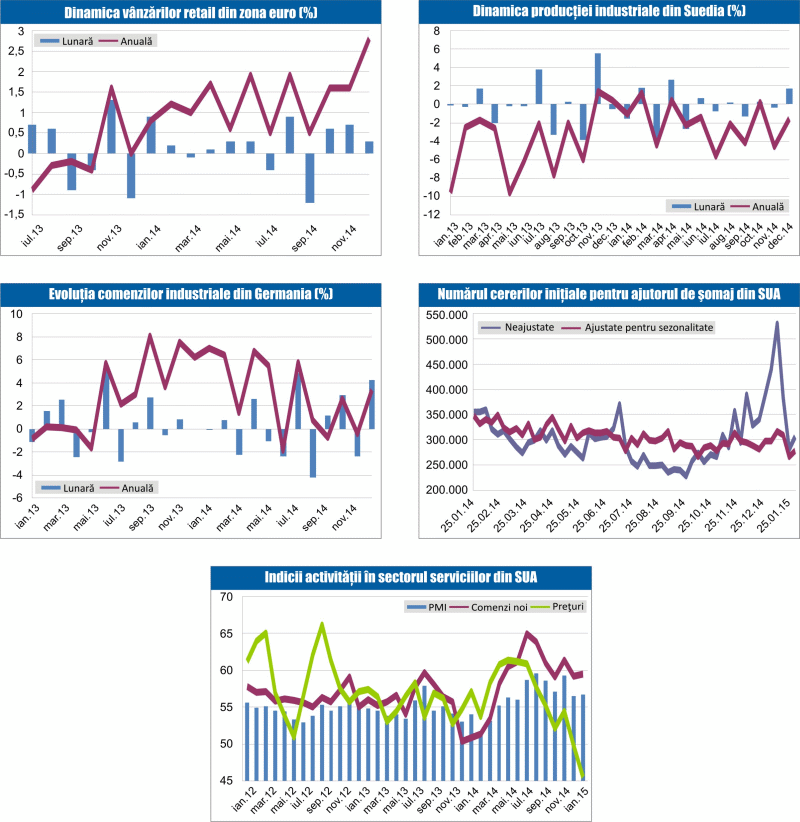 Vânzările retail din zona euro au crescut peste aşteptări în decembrie 2014, cu o rată lunară de 0,3%, după un avans de 0,7% în luna precedentă, iar creşterea anuală s-a accelerat până la 2,8%, de la 1,6% în luna anterioară. Vânzările retail din UE au crescut cu o rată anuală de 3,2%, în condiţiile unui avans lunar de 0,3%. La nivelul statelor UE, cele mai mari creşteri anuale s-au înregistrat în Luxemburg (+9,2%), Spania (+6,6%) şi Bulgaria (+6,4%), iar scăderi anuale în Finlanda (-2,6%), Slovenia (-2,5%) şi Malta (-1,4%).