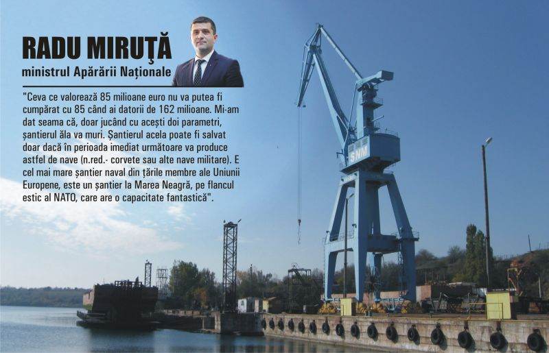 Radu Miruţă stated, last Thursday, during a press conference held at the Ministry of National Defense: "I tell you very confidently that, if I had a unique power in this country, I would not even think about legal methods by which you could save a strategic shipyard. (...) Something worth 85 million euros cannot be bought for 85 when you have debts of 162 million. I realized that, just playing with these two parameters, that shipyard will die. That shipyard can only be saved if in the immediate future it produces such ships (ed. - corvettes or other military ships). It is the largest shipyard in the member countries of the European Union, it is a shipyard on the Black Sea, on the eastern flank of NATO, which has a fantastic capacity. (...) It got to this situation because Romania allowed its skin to be torn off, while it applauded when others they were doing that. (...) I have no preferences and no taste for the tax codes of various companies. I am interested in producing these four ships within the period in which SAFE can use the money, that is, until 2030”.