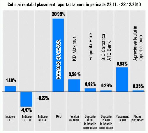 Totuşi, cel mai inspirat plasament, în perioada analizată, s-au dovedit a fi acţiunile "Bermas" Suceava (simbol BRM), cu o apreciere a cotaţiei de 20,99%, în condiţiile în care majoritatea titlurilor de la Bursa de Valori Bucureşti au suferit deprecieri.