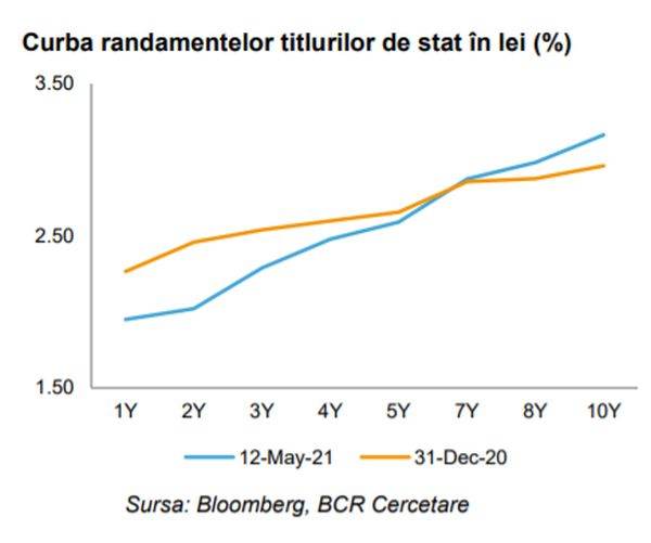 Ieri, în piaţa secundară, randamentul pe scadenţa 10 ani a României, barometrul pentru costul de finanţare din economie, a urcat la un maxim al ultimelor două luni şi jumătate, respectiv 3,28%, după ce în debutul lunii mai a scăzut la 3% de la 3,4% în 1 martie. Costul de finanţare pe 10 ani al României a atins un minim istoric de 2,66% în 11 februarie. Recuperarea terenului pierdut iniţial a venit pe fondul scăderii randamentelor pe pieţele externe, în special pe piaţa de obligaţiuni din Statele Unite.