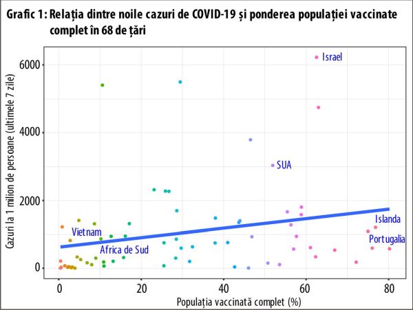 ""Linia tendinţei arată, de fapt, că există o asociere marginal pozitivă între cele două variabile, adică ţările cu un procent mai ridicat al vaccinărilor complete au mai multe cazuri de COVID-19 la un milion de persoane", se mai subliniază în articol."