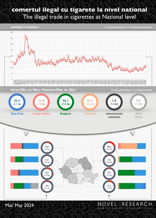 "În luna mai, contrabanda înregistrează cea mai mare creştere în nord-est, cu 5,2 p.p. până la 26,5%, regiunea continuând să fie cea mai afectată de comerţul ilegal cu ţigarete. De asemenea, în zona de sud-est piaţa neagră creşte cu 2,6 p.p. până la 7,4%. Din punct de vedere al provenienţei produselor de pe piaţa neagră, cea mai mare pondere o deţine în continuare Duty Free (36,3%) deşi se află în scădere, urmată de Moldova, aflată în creştere cu 7,4 p.p. până la 23,3% şi de Bulgaria (22,1%, în creştere cu 1,6 p.p.)", a declarat Marian Marcu, Director General Novel Research, conform unui comunicat de presă remis Redacţiei.