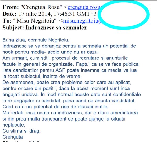 Practic, traficantul de influenţa îi semnala lui Negriţoiu (în urma unui email primit de la viitorul câştigător, desigur, deja desemnat) că presa ar putea să sape şi să observe că, ,,candidatul'' are CV-ul cam coafat şi că se pot face legături între relaţiile anterioare cu Negriţoiu dar şi cu statutul de ambasador şi potenţat al aceleiaşi perioade comuniste din care s-a originat şi Negriţoiu. ,,Am urmărit, aşa cum ştiţi, procesul de recrutare şi anunţurile făcute în genreal de organizaţie...''. În primul rând că procesul era destinat strict celor recrutaţi, iar anunţurile făcute de ,,organizaţie'' erau urmărite în felul următor: eu făceam un draft de comunicat de presă, Negriţoiu, incapabil să înţeleagă ASF, le transmitea la terţi, eliberând înainte de termen informaţii confidenţiale, terţul venea cu o contra-propunere de comunicat imbecilă, eu îi demonstram lui Negriţoiu că propunerea de comunicat este imbecilă, Negriţoiu revenea la varianta mea de comunicat, spurcându-mă în prealabil atunci când îi arătam că, contra-propunerea lui de comunicat este imbecilă: ,,ce nesimţit''. Astfel, terţul avea informaţii confidenţiale din ASF şi îşi putea trafica influenţa la Negriţoiu.