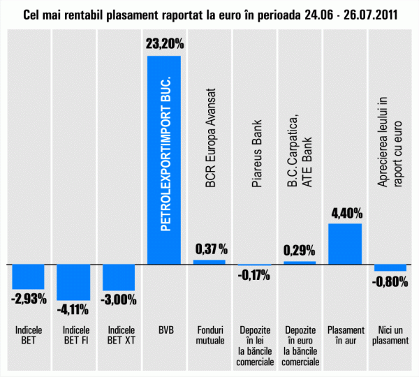 Tradiţionaliştii care au preferat, pe 24 iunie, să constituie depozite în euro la "Banca Comercială Carpatica" şi la "ATE Bank" au obţinut randamente uşoare de 0,29%. Investitorii care şi-au plasat economiile în depozite în lei, la "Piraeus Bank", au înregistrat pierderi de 0,17%.