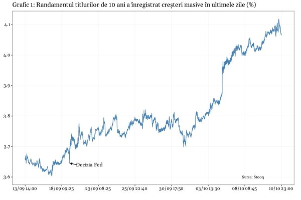 Randamentul titlurilor de 10 ani, considerate etalon al investiţiilor fără risc la nivel global, s-a angajat pe o traiectorie susţinută de creştere, iar în ultimele zile a revenit peste pragul de 4% (vezi graficul 1).