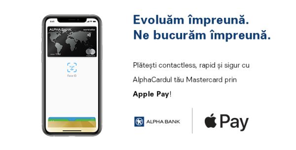 Începand de astăzi plăţile prin Apple Pay sunt disponibile şi pentru clienţii Alpha Bank Romania posesori de carduri Mastercard. Apple Pay este o modalitate de plată mai simplă, mai sigură şi personală, care îi ajută pe clienţi să evite transmiterea cardului către o altă persoană pentru efectuarea plăţii, atingerea butoanelor POSului sau plăţile în numerar - utilizând facilităţile iPhone care protejează fiecare tranzacţie.