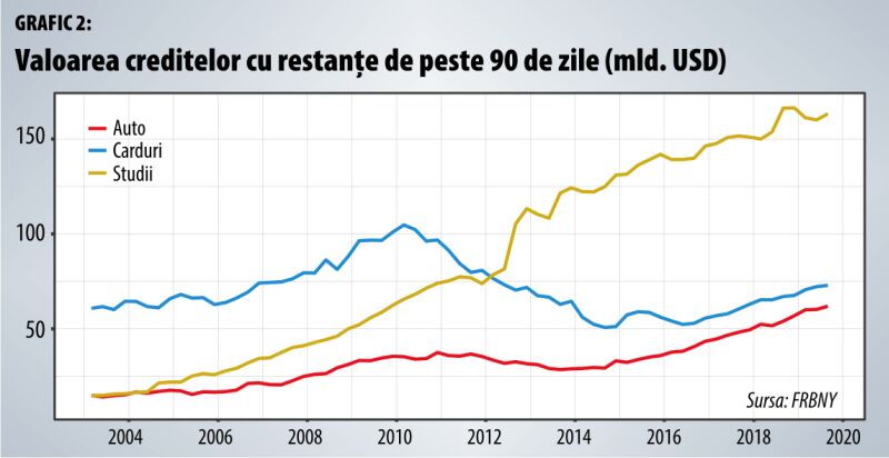 Atât soldul creditului auto cât şi soldul creditului pentru studii au atins noi recorduri în T3 2019, de 1,32 trilioane de dolari, respectiv 1,5 trilioane. În ceea ce priveşte creditul acordat pentru achiziţia autovehiculelor, tendinţa de creştere continuă să fie alimentată de reducerea semnificativă a standardelor de creditare.
