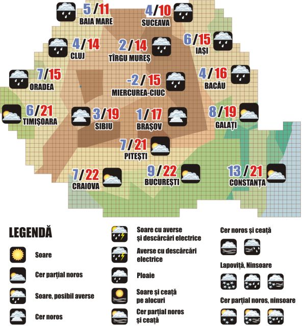 Vremea va fi mai rece decât în mod normal la această dată în nord şi parţial în centru, dar şi uşor mai caldă în restul ţării. Vor fi înnorări şi va ploua, în general slab cantitativ, în Maramureş, local în Transilvania, Moldova şi la munte şi pe areale mici în Dobrogea. În celelalte regiuni cerul va fi variabil, iar ploi slabe se vor semnala cu totul izolat. La altitudini în general de peste 1500 m, trecător vor fi precipitaţii sub formă de lapoviţă şi ninsoare. Vântul va sufla slab şi moderat, cu unele intensificări ziua la munte, în special în masivele vestice, iar noaptea în sud-estul teritoriului. Temperaturile maxime se vor situa între 10 şi 24 de grade, iar cele minime vor fi cuprinse între 1 şi 12 grade. Pe alocuri se va forma ceaţă.