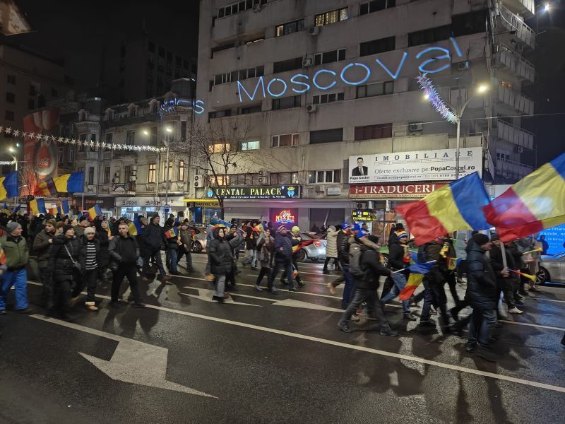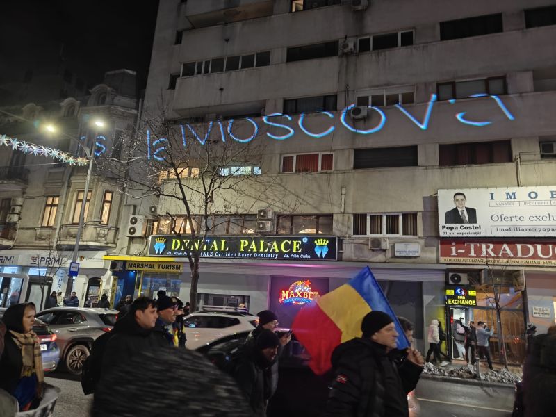 Actualizare - Un cetăţean, care nu este de acord cu mesajele participanţilor la mitingul din această seară, a proiectat pe blocurile de pe o parte a bulevardului Nicolae Bălcescu un mesaj luminos: „Marş la Moscova!"