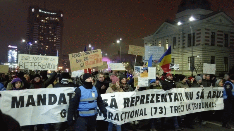Zeci de mii de oameni au ajuns în faţa sediului Guvernului, în această seară, pentru a protesta faţă de proiectele Executivului vizând graţierea şi modificarea Codurilor penale, după un marş pe traseul Piaţa Universităţii - Piaţa Unirii - Calea Victoriei - Bulevardul Magheru - Piaţa Romană - Piaţa Victoriei.
