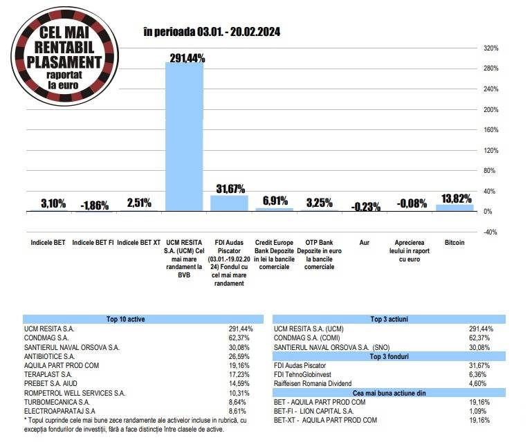 În topul randamentelor de BVB din intervalul 3 ianuarie - 20 februarie 2024 se situează titlurile UCM Resita, ce au crescut cu 291,44%. Pe locul al doilea se află acţiunile companiei Condmag, cu o creştere de 62,37%, iar pe locul al treilea se află titlurile Şantierul Naval Orşova, cu o apreciere de 30,08%.