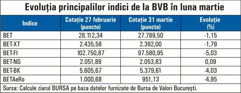 Indicii Bursei de Valori Bucureşti (BVB) au avut scăderi, în cea de-a treia lună a anului, în ton cu deprecierile pieţelor de acţiuni globale, ce au fost afectate de războiul din Orientul Mijlociu, declanşat în urma atacării Iranului de către Statele Unite, al cărui efect a fost blocarea traficului prin Strâmtoarea Hormuz, punct important pentru aprovizionarea cu petrol şi alte materii prime. Indicele BET, al celor mai lichide douăzeci de titluri ale pieţei noastre, a încheiat luna martie cu o scădere de 1,15%, la 27.789 de puncte, în vreme ce indicele BET-BK, reperul de randament al fondurilor de investiţii în acţiuni, s-a depreciat cu 4,03%, până la 5.379 de puncte.