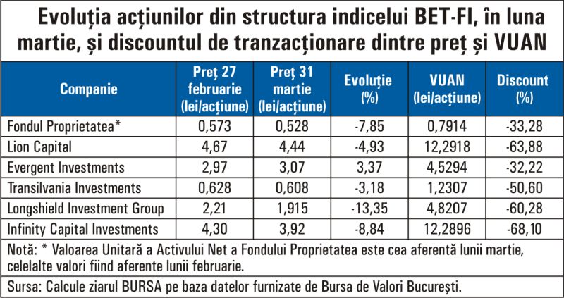 La finalul lunii martie, fostele SIF-uri se tranzacţionau la discounturi între preţul de piaţă şi Valoarea Unitară a Activului Net (VUAN), cuprinse între 68% în cazul Infinity Capital şi 32% pentru Evergent Investments. Pentru Fondul Proprietatea, discountul era de 33%, peste obiectivul administratorului Franklin Templeton, care vizează un nivel sub 15%.