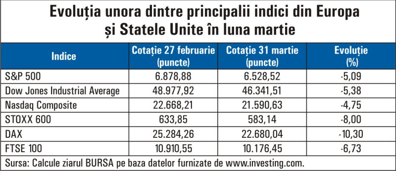 În acest context, în Statele Unite, indicele S&P 500 s-a depreciat cu 5,1%, în martie, declin ce a fost recuperat integral pe parcursul acestei luni, în vreme ce indicele Dow Jones Industrial Average a scăzut cu 5,4%. Indicele Nasdaq Composite, al companiilor ce activează în domenii intensive în cunoaştere, a avut un recul de 4,7%, scădere ce a fost, de asemenea, rapid recuperată. De partea noastră a Atlanticului, indicele Stoxx 600 s-a depreciat cu 8%, în vreme ce indicele DAX, al bursei din Frankfurt, a avut un recul de 10,3%.