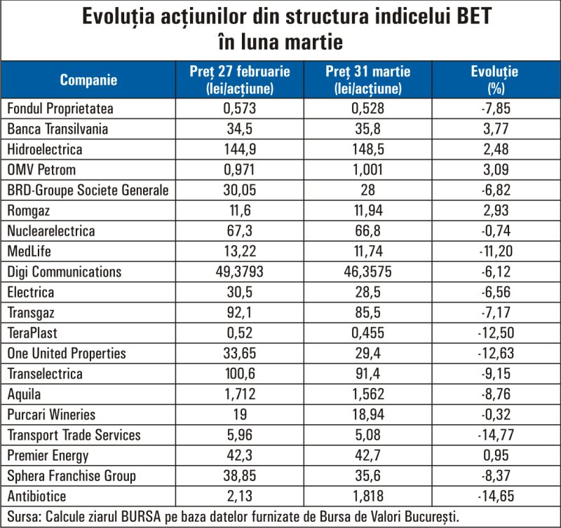 Acţiunile producătorului şi furnizorului de energie Hidroelectrica s-au apreciat cu 2,5% luna trecută, în condiţiile în care preţul energiei a crescut la nivel global, ca efect al situaţiei din Iran. Conducerea companiei a propus alocarea unui dividend de 7,348365 lei din profitul anului trecut, echivalentul unui randament net de 4,1%. Titlurile Nuclearelectrica au avut o mişcare laterală în martie, conducerea companiei propunând alocarea unui dividend de 3,91 lei, echivalentul unui randament net de 4,9%.