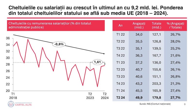 Problema principală a României nu o reprezintă cheltuielile publice, care sunt printre cele mai scăzute din UE, ci veniturile scăzute. Creşterile recente ale cheltuielilor, determinate de modificarea Legii Pensiilor şi de majorările salariale (inclusiv pentru educaţie şi sănătate), au fost necesare pentru a asigura echitatea socială. Aceste creşteri au stimulat consumul, menţinând astfel o creştere economică de +1.4% în 2024, deşi aceasta a încetinit faţă de 2023. Problema nu este îndatorarea, ci costul împrumuturilor pentru statul român, care creşte rapid.