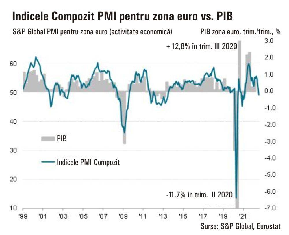 Economia zonei euro a înregistrat o contracţie a activităţii de business în primele trei săptămâni din luna iulie, care devine prima lună de contracţie din ultimele 17, arată indicatorii preliminari Purchasing Managers' Index (PMI) publicaţi vineri de S&P Global pentru luna curentă. Astfel, indicatorul PMI Compozit (sectorul manufacturier + servicii) a scăzut de la 52,0 puncte în iunie la 49,4 în iulie, semnalând o contracţie a activităţii pentru prima dată din februarie 2021, când economia zonei euro s-a confruntat cu noi lockdown-uri. Excluzând lockdown-urile asociate pandemiei, contracţia economiei din iulie este prima din iunie 2013 încoace, datele indicând o rată de scădere de -0,1% pentru luna iulie faţă de trimestrul al doilea din acest an.