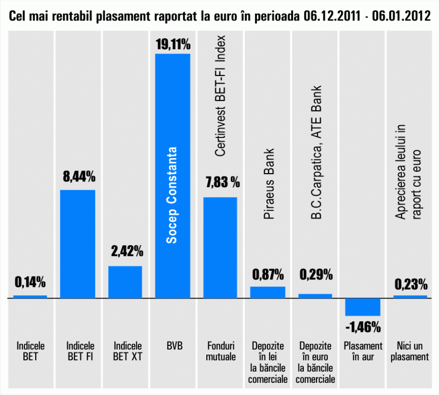 Tradiţionaliştii care au preferat, pe 6 decembrie 2011, să constituie depozite în euro, la "Banca Comercială Carpatica" şi la "ATE Bank", au obţinut randamente uşoare, de 0,29%. Investitorii care şi-au plasat economiile în depozite în lei, la "Piraeus Bank", au câştigat 0,87%.