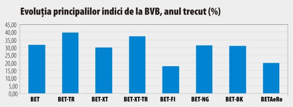 The BET index, which captures the evolution of the twenty most liquid securities of our market, had an increase of 31.8% last year, while with all dividends, the appreciation of the share basket, reflected by the evolution of BET-TR, raised to 39.9%, both indices marking new historical records. BET-BK, the performance benchmark for equity mutual funds, climbed 31%, while the BET-FI financial index, which has lost much of its prominence more than a decade ago, had a growth of almost 18% last year.