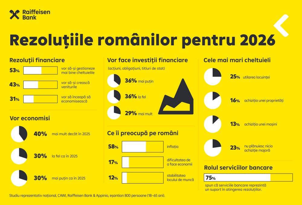Cercetarea privind rezoluţiile românilor pentru 2026 face parte din seria Despre Bani 1:1, derulată de Raiffeisen Bank România. Studiul a fost realizat în colaborare cu Appinio, prin metoda CAWI, pe un eşantion de 800 de persoane cu vârste între 18 şi 65 de ani, reprezentativ la nivel naţional, în luna ianuarie 2026, a concluzionat sursa menţionată.