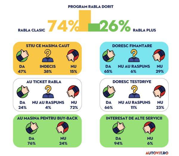 Rabla Clasic râmâne programul preferat al utilizatorilor de pe platforma Autovit.ro şi în 2021, conform datelor transmise. Trei sferturi dintre participanţi au răspuns că şi-ar cumpăra o maşină nouă cu motor pe combustie şi cu o subvenţie de 7500 de lei, de la stat.