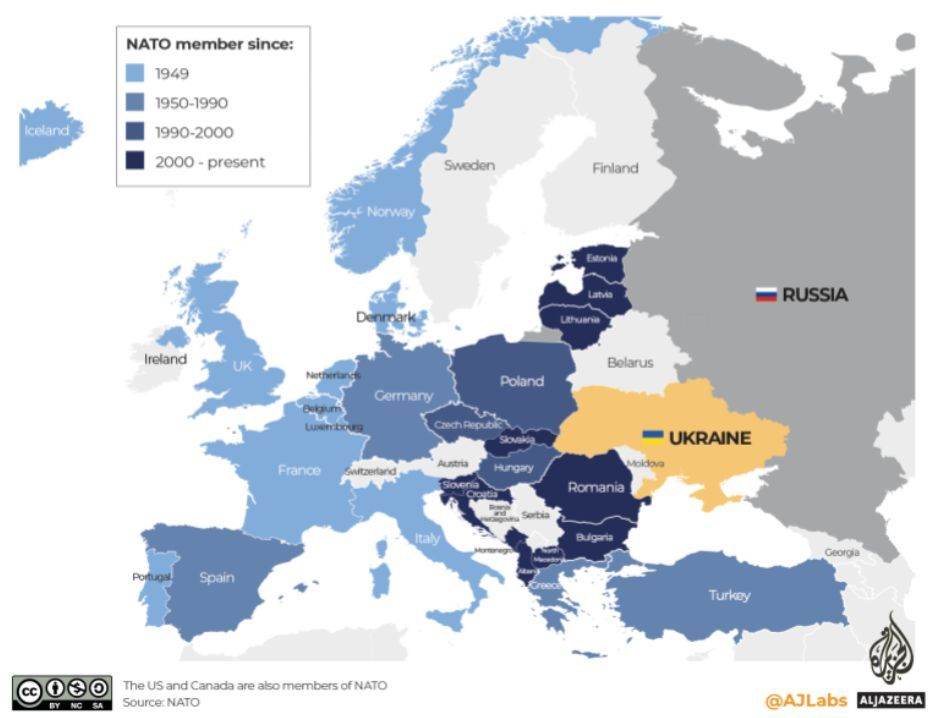 Rusia se opune bazelor NATO din apropierea graniţelor sale şi a cerut garanţii scrise că Alianţa nu se va extinde spre Est. Una dintre revendicările centrale ale Kremlinului este ca Ucrainei să nu i se permită niciodată aderarea la. Statele Unite s-au opus acestei cereri.