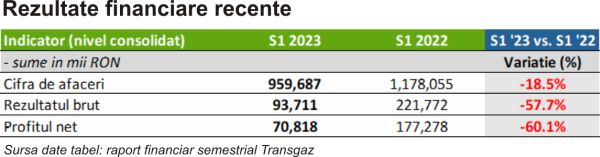 În primele şase luni ale acestui an, Transgaz şi-a majorat veniturile din activitatea de transport intern până la 634,7 milioane de lei (+7% faţă de semestrul întâi din 2022), precum şi veniturile din activitatea de transport internaţional până la 58,9 milioane de lei (+39%). Cu toate acestea, cifra de afaceri consolidată, care înglobează şi alte elemente, a scăzut. Deşi rezultatul din exploatare a fost de aproape 32,9 milioane de lei (+11,8% faţă de primele şase luni din 2022), diminuarea veniturilor financiare a contribuit la scăderea accentuată a profitului net consolidat.