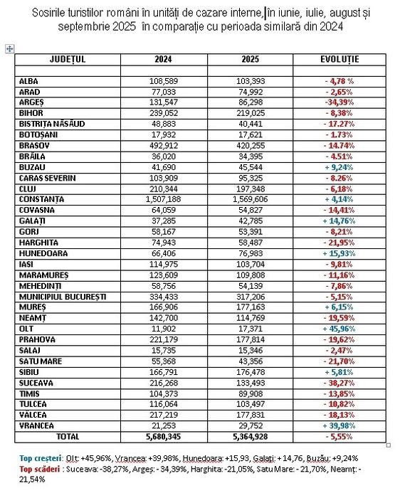 Datele centralizate pentru lunile iunie-septembrie 2025 arată o contracţie vizibilă a pieţei turistice interne, prima după perioada pandemiei, semnalând dificultăţi majore pentru operatorii din sectorul HoReCa. Mulţi dintre aceştia au fost nevoiţi să reducă investiţiile în servicii şi promovare sau să recurgă la restructurări de personal, pe fondul presiunii fiscale crescute şi al scăderii cererii.
