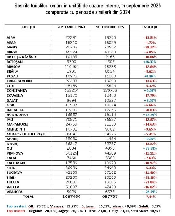 Conform analizei BIBI Touroperator, pe baza datelor INS, cele mai mari creşteri în numărul de turişti au fost înregistrate în judeţele Olt (+45,96%), Vrancea (+39,98%), Hunedoara (+15,93%), Galaţi (+14,76%) şi Buzău (+9,24%). Cele mai accentuate scăderi s-au înregistrat în Suceava (-38,27%), Argeş (-34,39%), Harghita (-21,05%), Satu Mare (-21,70%) şi Neamţ (-21,54%).