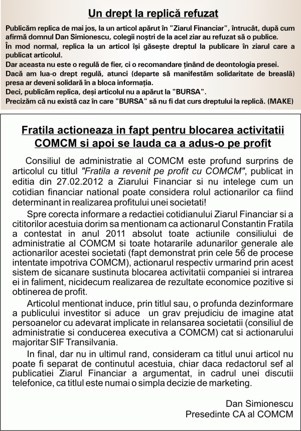 Ziarul falimentar Bursa publica un drept la replica nepublicat de un ziar citit si cautat de mii de specialisti.Acesta se numeste parazitism sau cum supravietuieste limbricul in intestinele omului. Este evident cine este mancatorul ce kkt.