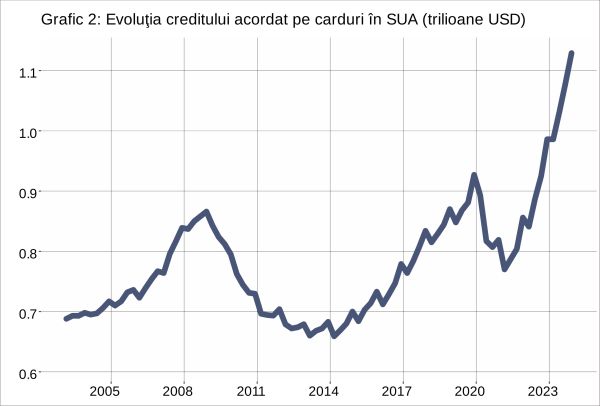 După ce a depăşit pragul de 1 trilion de dolari în T2 2023, soldul creditului acordat pe carduri şi-a continuat creşterea accelerată şi în ultimul trimestru al anului. Avansul trimestrial a fost de 50 de miliarde de dolari, până la un nou record, de 1,129 trilioane, iar avansul faţă de aceeaşi perioadă a anului trecut a fost de 142 de miliarde de dolari (vezi graficul 2).