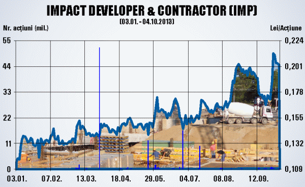 Pe fondul schimbărilor din acţionariat, acţiunile Impact au crescut puternic în acest an, dublându-şi preţul, de la 0,115 lei la finele anului trecut la un vârf de 0,231 lei, în timpul şedinţei de luni.